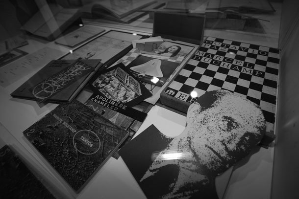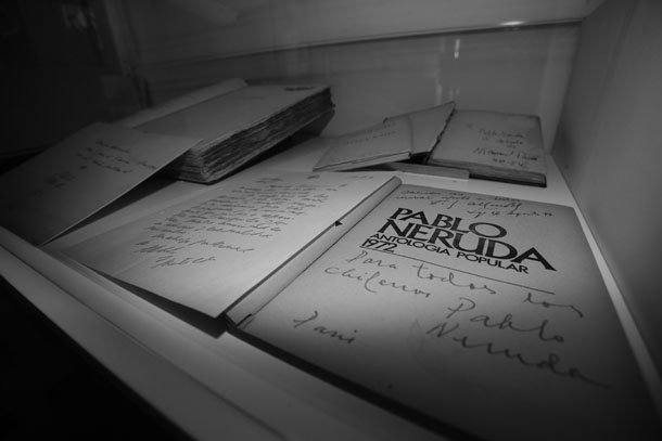 Entre los documentos y objetos que se incluyen en la muestra hay recortes de prensa, fotografías dedicadas, poemas inéditos enviados a modo de agradecimiento, primeras ediciones o ediciones especiales, dedicadas, anotadas o autografiadas. Brilla especialmente la vitrina de Pablo Neruda, autor de quien Santiago Vivanco tiene “una de las mejores colecciones a nivel mundial”, según explicó Pérez Pastor. En ella se encuentran, por ejemplo, la primera edición de Crepusculario (1923), un ejemplar de El rayo que no cesa de Miguel Hernández dedicada por él mismo a Neruda, o un ejemplar único del poema Las piedras del cielo, dedicado por Neruda (en color verde, como a él le gustaba) a otro premio Nobel: Gabriel García Márquez. A los libros y manuscritos se suman además objetos curiosos, como el libro-maleta de Octavio Paz y Marcel Duchamp (1968), y también ejemplos de la cultura popular relacionados con los galardonados, como sellos con la efigie de García Márquez o billetes de Echegaray (1.000 pesetas) y Juan Ramón Jiménez (2.000 pesetas).