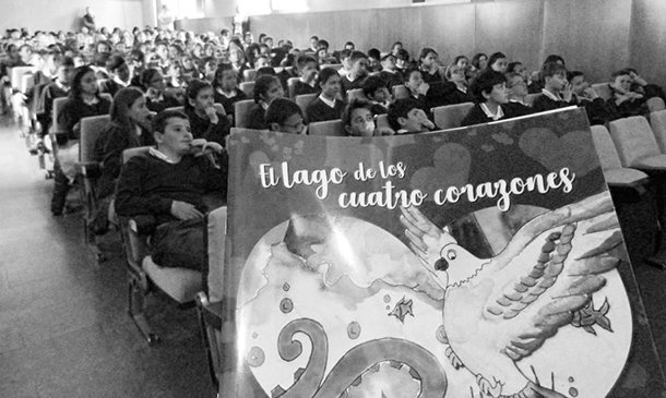 Cáritas La Rioja ha presentado 'El lago de los cuatro corazones', un cuento solidario que explica el sentido de la entidad social. Casi 200 escolares de los colegios Jesuitas y Adoratrices han participado en el acto, celebrado en la Biblioteca de La Rioja, donde han estado presentes el escritor, Antonio de Benito, que lo ha redactado altruistamente, y la ilustradora, Teresa Fudio. Para acercar la obra a los estudiantes, Raquel Gonzalo, de la compañía profesional de clown y títeres Violeta y Péndula, ofreció una animación de la fábula a través de diferentes actividades lúdicas.
