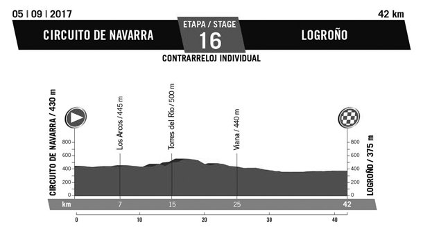 La etapa 16 de la Vuelta enlaza el Circuito de Los Arcos con la capital riojana a través de una contrarreloj de 42 kilómetros, prácticamente llanos en su totalidad, que convierten al británico Chris Froome en favorito para terminar la jornada habiendo incrementado su ventaja sobre sus rivales en la clasificación general. En la lucha por el maillot rojo de líder tan sólo el holandés Wilko Kelderman y el ruso Ilnur Zakarin parecen capacitados, entre los diez primeros clasificados, para mantener el tipo en la lucha contra el reloj en una prueba sin ninguna cota de montaña en el recorrido. Seguro que Nibali y Contador –que siempre fue bien contra el crono- lo dan todo para que las ‘aventuras imposibles’, que tanto les gustan tanto al italiano como al español, no sean imposibles en los días que aún restan antes de llegar a Madrid.