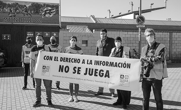 La Asociación de Informadores Gráficos de La Rioja (AiG) junto a más de 20 asociaciones de fotoperiodistas de toda España reclamaron ayer, frente a los accesos al Campo de Fútbol Mundial 82 y en diferentes puntos de toda España, que no se juege con el Derecho a la Información al excluir a su colectivo de los entrenamientos y la competición. Se trata de un problema derivado de la orden del Ministerio de Sanidad que rige durante el Estado de Alarma y una restricción que pretende establecer en lo sucesivo la Liga de Fútbol Profesional de acuerdo con el Consejo Superior de Deportes.