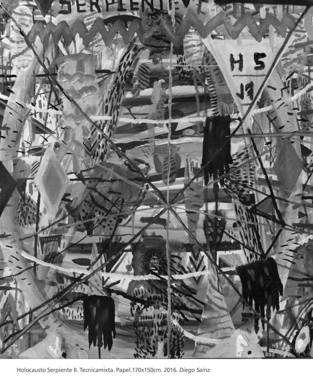 La pintura de Diego es libertad en estado puro, "con un trasfondo de alegría y azar". Su pincel navega sobre el lienzo virgen "en busca de un itinerario mental en el que aflora el autor de una manera explosiva". Colores, figuras y frases superpuestas invitan a descubrir a golpe de machete la selva cromática que plantea el autor en aras de compartir su espacio de libertad.