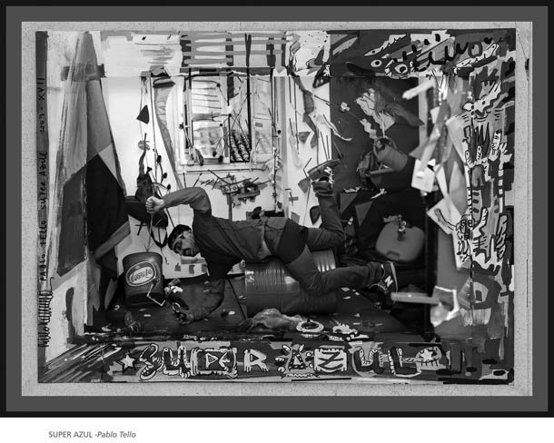 Pablo, por su parte, pintor en otro tiempo, practica una fotografía incendiaria en la que no quedan espacios para el consuelo. Cada obra de Pablo Tello es una escenografía teatral en la que cada objeto es simbólico, incluso el mismo autor aparece sumergido en un universo que trata de explicar el mundo por la lucha de contrarios.