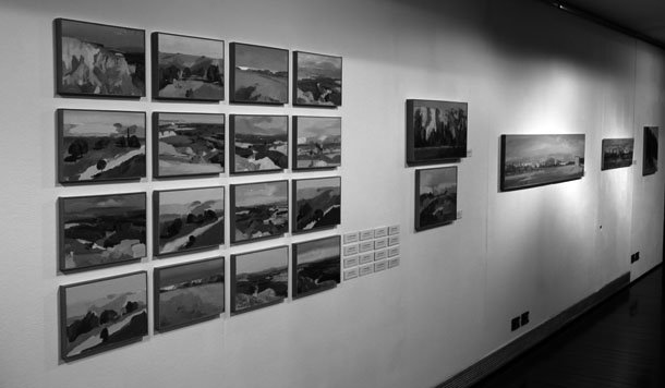 Al recorrer la sala, el visitante encuentra diferentes formatos y maneras de acercarse al paisaje. Surgen así los dieciséis cuadros en pequeño formato que Garrido describe como apuntes o notas de colar y que brotan de sus pinceles en unas pocas sesiones. También, los óleos de mediano y gran formato que crecen sobre el lienzo a través de las sesiones y el trabajo continuado. “Necesito acudir a la revelación que dicta ese lugar y que es la suma de muchos instantes. Entonces dependo de la climatología y de la luz. Al abordar las pinturas de gran tamaño es preciso una mayor intención, un mayor planteamiento”.