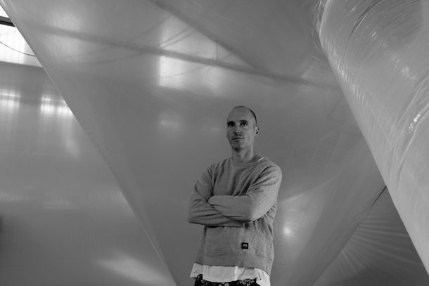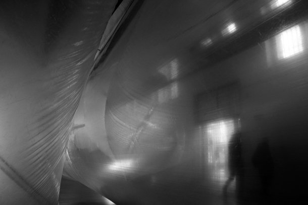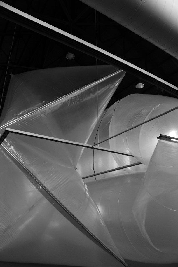 ‘Paralorelei’ son dos tubos de plástico de 65 y 55 metros de longitud respectivamente que juegan entre sí y, al mismo tiempo lo que originalmente era el espacio diáfano de la sala. Habla el artista de la idea de escultura neumática. “Me interesa más –explica- lo estético que lo conceptual, pero es cierto que al trabajar en esta obra rondaba la idea de lo paralelo”. Los tubos por los que circula el aire no parecen presionar el piso, las paredes, ni el laberinto de traviesas que entrelazan la cubierta. Más bien, ‘Paralorelei’ aparenta haber encontrado tres camaradas en los límites de la sala. “De alguna manera es así–indica-, es lo que persigo con mis intervenciones, poner en cuestión el límite de lo que tenemos asumido como espacio; al realizar mis obras planteo unas nuevas reglas espaciales”. ‘Paralorelei’ y el espacio ilimitado del arte y la creatividad./Javi Muro
