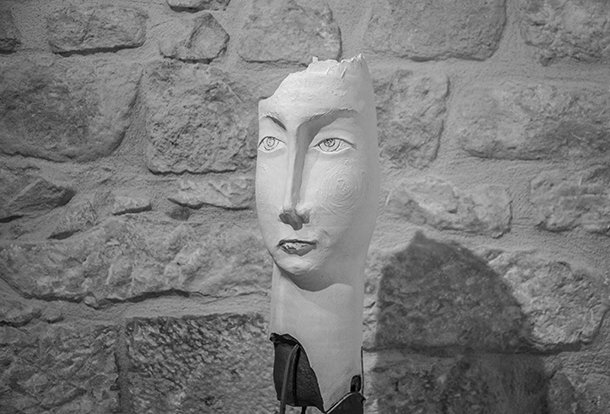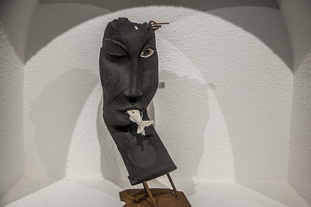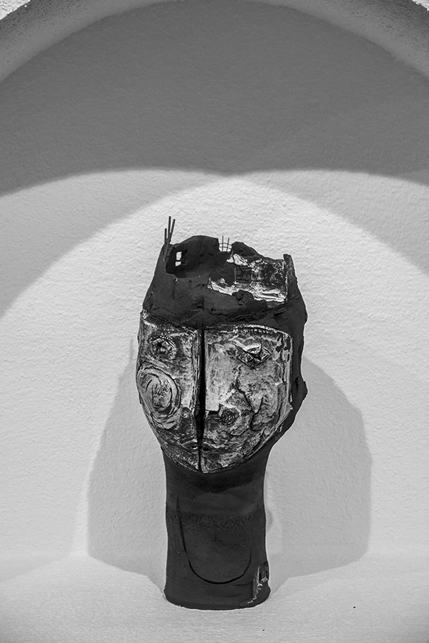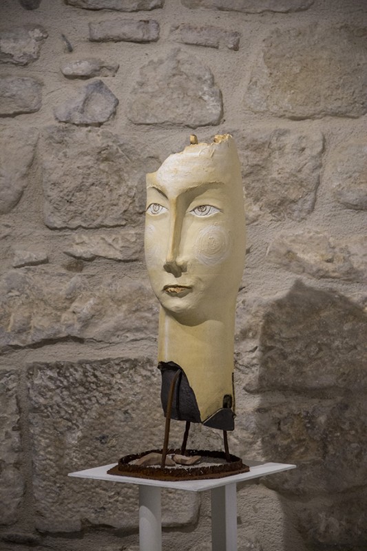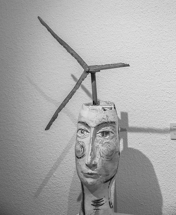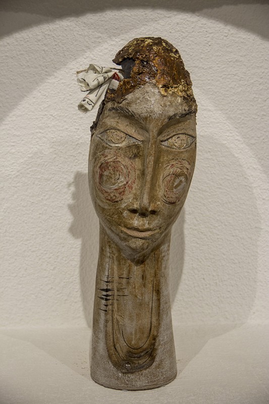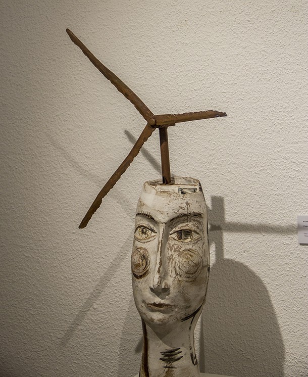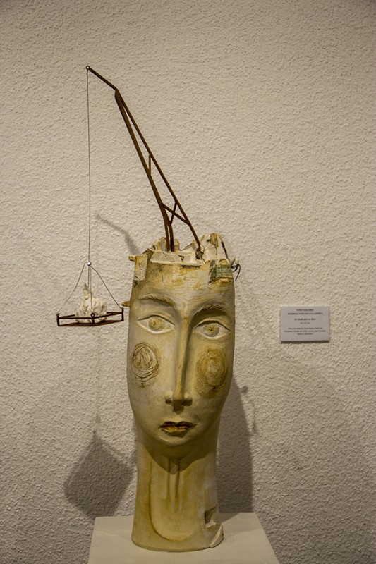 A través del barro Toño Naharro también reflexiona sobre el mundo, sobre la actualidad, sobre las situaciones que nos rodean y tratan de determinarnos. La pieza ‘Se vende piso en Kiev’ muestra una cabeza bombardeada. Aniquilación, destrucción total, no hay electricidad, no hay luz. Sólo queda huir con las pertenencias de máxima urgencia, con lo mínimo. El día a día ya no existe, la ilusión se ha desvanecido. La cabeza creada por Naharro se pregunta: “¿Qué más nos queda? ¿Quién quiere comprar un piso en Kiev?”. El artista trata de encontrar respuesta a la probabilidad de éxito de la convivencia del ser humano y la naturaleza. ‘Convivencia razonable e imposible’ titula otras de sus esculturas. “Volvamos la mirada hacia la naturaleza -invita- e intentemos ponernos de acuerdo con ella. Parece como si no hubiéramos nacido de la tierra. No somos dioses, ni falta que hace”. Demasiada tontería borbotea en la sociedad del siglo XXI insinúa Naharro y ahonda en la idea a través de la cabeza escultórica ‘De postureo en la azotea y plástico en el estómago’. Dice Toño Naharro que “con tanta tontería se nos deformó la cabeza”. Y al final el ‘Caos’, la escultura que remata la exposición habla del desorden, de lo inquietante.