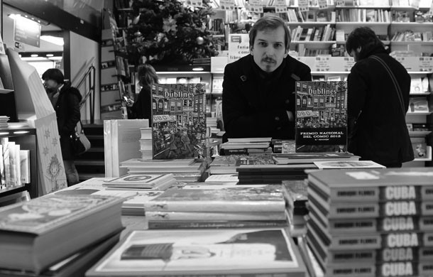 Asturiano de Blimea, Alfonso Zapico, ha siso galardonado con el Premio Nacional de Cómicn 2012. Un reconocimiento que parece haberle sorprendido, pero que quienes le siguen saben oportuno y justo. Alfonso Zapico crea historias gráficas, pero también es ilustrador, trabaja en publicidad y prensa, e imparte talleres. Y lo hace todo desde la localidad francesa de Angulema; en concreto desde su Escuela de Arte. Un lugar que viene a ser -si nos dejamos guiar por las palabras de Alfonso-, algo así como pequeño paraíso creativo. Su primera novela gráfica fue 'La guerra del profesor Bertenev', a la que siguió 'Café Budepest' -ambas con historias con compromiso en las que se describían conflictos históricos- después llegó 'Dublinés', una historia sobre la vida del escritor James Joyce, pero que es mucho más que una biografía, "es una celebración de la vida". Por 'Dublinés' recibió el Premio Nacional de Cómic,/Javi Muro
