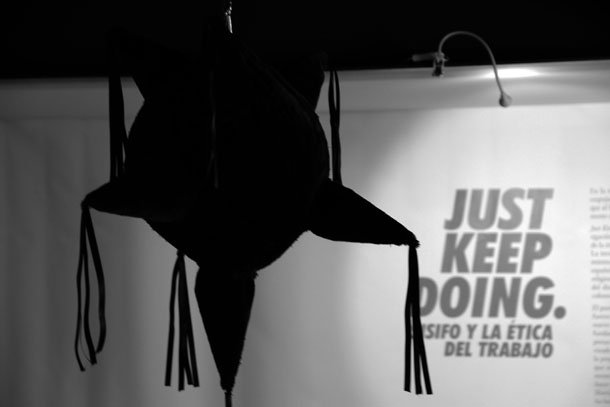 Sergio.- Creo que toda la dimensión crítica del proyecto se podría sintetizar en la pequeña fotografía que hay clavada en la pared al final de la sala. En ella, observamos a un sujeto -quizá el propio Sísifo-, agotado tras tratar demasiado de romper la piñata, al parecer sin resultados. Este agotamiento, producto del trabajo que nunca termina, y que, como parón improductivo, se ha convertido en tabú (recordemos los slogans de deporte, la apología de la vida activa, del multitasking, la imposición de estar siempre disponible…), pretendiendo ser ocultado y suprimido como algo indeseable. Hoy se nos hace creer que somos libres de lograr por nosotros mismos cualquier cosa que nos propongamos, como si fuéramos seres ilimitados, casi divinos. Por supuesto esto no es así, nuestras capacidades son limitadas, y su abuso se traduce en las diversas patologías hoy ampliamente extendidas: el síndrome de burnout, la sobrecarga social, el síndrome de fatiga informativa… Nosotros queremos reivindicar el derecho al cansancio y a la inactividad. Como diría el escritor Martí Perán, entendemos la fatiga como posible espacio para la emancipación.