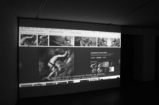 Víctor.- Así es. Enfrente, colgada del techo, tenemos la piñata blanda, una imagen o metáfora que busca impregnar toda la instalación. En la pared opuesta, un par de fotografías del primer registro de este trabajo en la que también se resume de manera sumaria la exposición: la producción, la acción -golpear la piñata- y el agotamiento. Por último, en la pared del fondo se encuentra proyectado el video protagonista de la exposición, Searching Sisyphus, un video breve en el que se busca actualizar el mito de Sísifo desde el punto de vista de la era de la información y la sociedad del rendimiento.