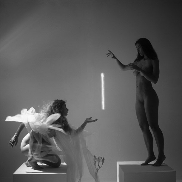 El cuerpo me ha servido como soporte para expresar la paradoja entre una realidad sensible y otra espiritual. Yo percibía esta tensión en mi propio ser y, con el tiempo, he sabido que, en el fondo, respondía a una búsqueda de equilibrio. Por ello desde un inicio intentaba traspasar el cuerpo físico, mostrando su interior en su apariencia exterior. Con la desnudez, lo devolví al origen, a la pureza y a la inocencia del Paraíso. Ahora lo estoy hiriendo con rayos de luz, luz que pertenece al mundo de lo visionario, luz que transforma y transfigura. Todavía el cuerpo aparece intacto, pero, sin embargo, levita como símbolo de sutilización y espiritualización.