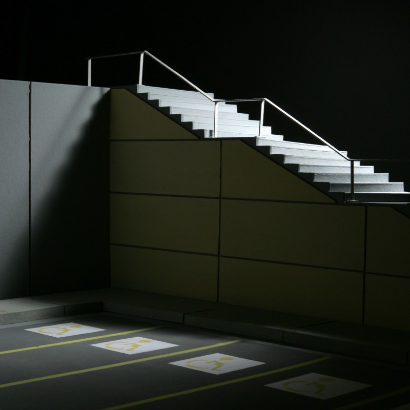 Sí. De alguna manera el juego, el modus operandi, del que parto en mis proyectos sí que surge de ahí. Tampoco es siempre el mismo, ya que como decía antes la fotografía se encuentra siempre entre el documento y la ficción; siempre tienes que fotografiar algo que pertenece al mundo real, pero si ese algo es un doble de la realidad –una maqueta- estamos poniendo en marcha ese juego entre realidad y ficción, como un lugar intermedio. De ahí el título de la exposición ‘Lugares intermedios’, la maqueta como un lugar intermedio entre la realidad y la ficción. Al trabajar parto de fotos que forman parte de mundo real, en esa serie eran parkings en las afueras, en centros comerciales, y en una segunda parte, en base a esas imágenes, construía los espacios –las maquetas- que luego volvía a fotografiar. Y después, jugando con la luz y las sombras, se crea ese misterio al que te referías. Eso lo construyes todo ya en el estudio. Vemos un espacio representado en la foto que resulta un poco extraño, que tiene que ver también con la pintura e incluso con el cine, que tiene una cierta irrealidad producto de que es un doble.