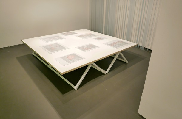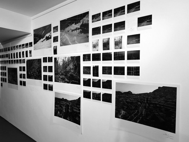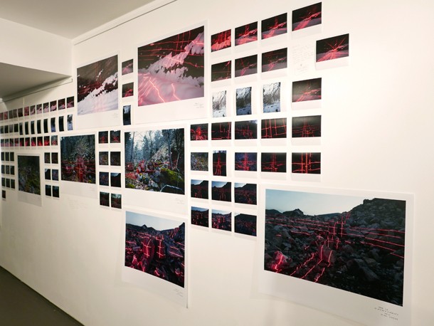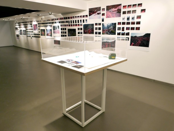 Ocupando la pared principal, una serie de fotografías organizadas a modo de fotogramas retratan paisajes y accidentes orográficos vectorizados por la incidencia del nivel laser. Frente a las imágenes, una vitrina acoge dibujos que serpentean sobre las radiografías del terreno que el haz de luz roja sobre expuesto.