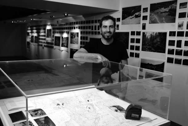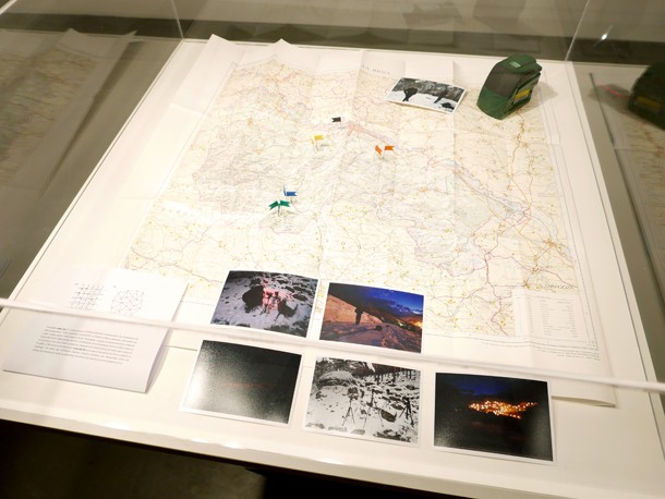 En el centro de la sala un mapa muestra el territorio en papel y sobre el alfileres en forma de banderolas reflejan los lugares geográficos donde Julio tomó las imágenes. Fueron diez salidas para la búsqueda, localización previa y realización de las fotografías. “El proyecto –añade Sarramián- tiene un aquí y un ahora. Tenía el hándicap de realizar las fotografías en la hora mágica, cuando se pone la luz del sol. Contaba con media hora más o menos, antes no se veía el láser, después lo que no se veía era el paisaje”.