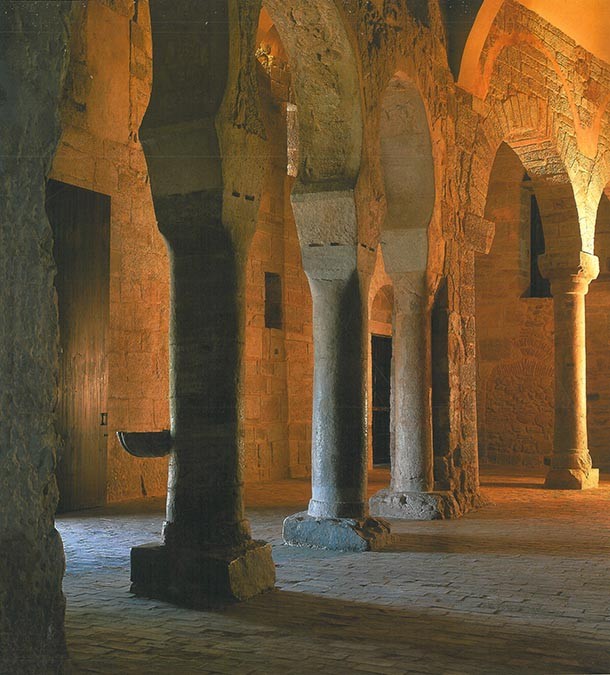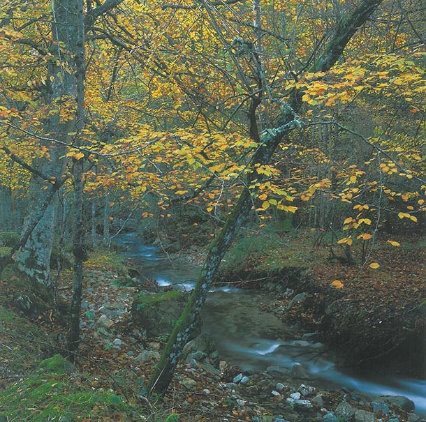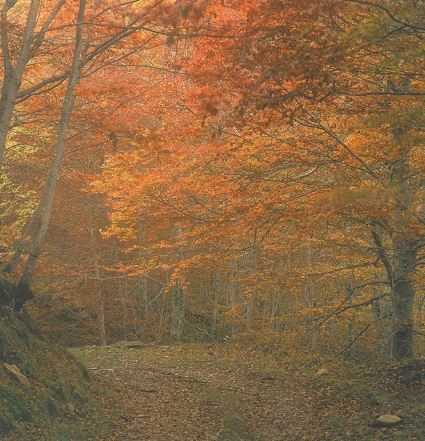 Las columnas del monasterio juegan a las sombras chinescas con la luz que capturan a través del ojo de aguja que observa el exterior desde la portada del templo. Quizá a fuera o quizá en otro valle las hojas verdes y amarillas camuflan las ramas de las hayas de la mirada a pie de tierra. Es el retrato del frondoso bosque en primer plano. No hay tregua a las fake news, el capitel cuenta el pasado tal y como fue o, al menos tal y como lo contempló el tallador. Es pura verdad como lo es el relato de la corteza de los robles o de las piedras, colocadas una a una, para formar el mosaico que forma la calzada. Mientras -también en retrato en primer plano- la vid saluda al sol y el agua -quizá del Iregua, quizá del Leza- se congela para que la mirada no pierda detalle del entorno. En la cumbre del Chilizarrias amanece y una lengua de fuego anuncia un bonito día. En 2003, el fotógrafo Kim Castells tuvo la oportunidad de recorrer La Rioja con su cámara. Tenía el encargo de publicar el libro ‘Paisajes para una Lengua’, que acogió una selección de 159 imágenes acompañadas de textos de Gonzalo de Berceo. Ahora, el fotógrafo ha donado al Gobierno de La Rioja 560 fotografías realizas durante el proyecto que le llevó a recorrer los caminos riojanos.