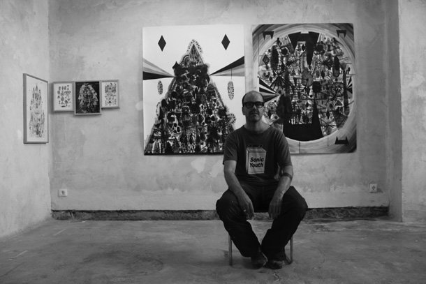 Aseguran desde Planta Baja que aún dudan si colocar a la entrada de la Sala de Exposiciones un cartel que advierta de la presencia de una fiera suelta en el interior. La bestia creativa a la que se refieren Aurora y José Miguel León es Diego Sáinz, un artista sobre el que tan sólo la ausencia de cables conectados a la camiseta de los Sonic Youth anula la sospecha de que pudiera estar enchufado a un generador eléctrico. Diego explica, reflexiona, señala detalles de sus obras, al tiempo que ordena los materiales empleados en el montaje de la exposición, y repasa el texto del catálogo. Todo al mismo tiempo y sin la mínima de huella de estrés. Quizá, vivir en Villoslada, en la Sierra de Cameros y en plena naturaleza, pueda ser el secreto de tanta energía positiva.