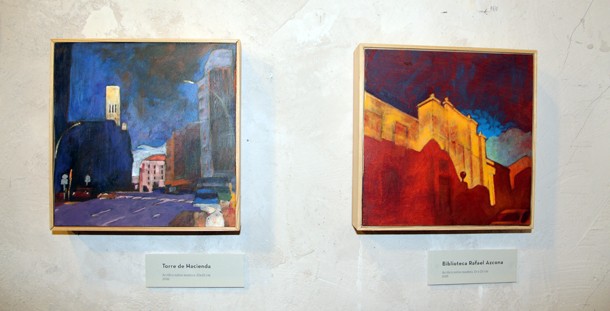 La pintura de Toño Vega cobra vida desde el vínculo que contraen luz, sombra y volúmenes. Así, el conjuro de los pinceles y la tela acoge los edificios de las calles Muro de Cervantes, Calvo Sotelo, Once de junio, Santos Ascarza, San Roque, Avenida Colón o Ruavieja; también las torres de Hacienda y de la Gran Vía; las plazas del Moderno o de San Bartolomé, la Chimenea de la antigua Tabacalera, la biblioteca Rafael Azcona o el tramo porticado de Rodríguez Paterna. Los cuadros de Vega son brillos de luz que transmiten emociones. No son tratados de arquitectura, sino punzadas que te recuerdan instantes vividos en esos lugares. “Pintar –señala- tiene sentido tanto en cuanto alegra la vida de las personas que contemplan y disfrutan los cuadros, no cuando los acumula en casa o en el estudio el propio autor”.