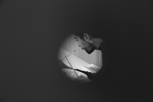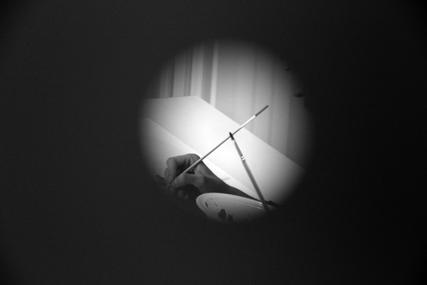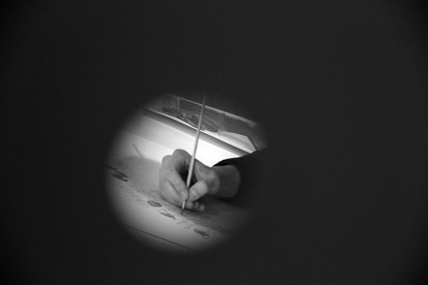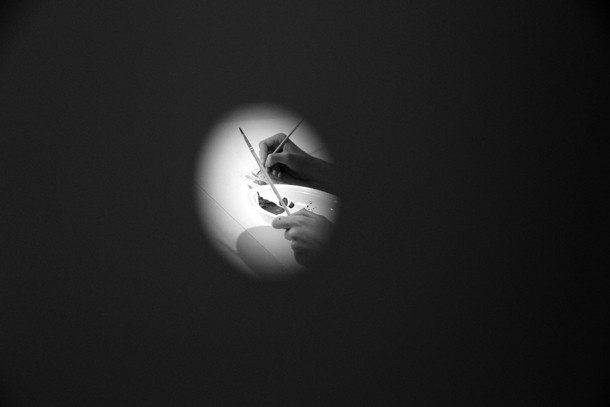 El dibujante ha regresado al interior de la caja. Por la Sala del IRJ desfila un público ávido por descubrir, quizá curioso, quizá con una dosis de voyerismo, observador y abierto a sorprenderse. Se aproximan a la caja y centran su mirada a través de una de las perforaciones que comunican con el interior. La perspectiva elegida ofrece al artista inmóvil analizando la última pincelada, si la varías el ángulo de la mirada puedes observar como su mano se mece siguiendo el bamboleo de los lápices, o como sus manos dibujan esbozos en el aire, o sobre la lámina, que por arte de magia muestra, poco a poco, trazos y colores. Una chica retira la mirada de la caja mientras se ajusta la bufanda. “Parece increíble”, dice sorprendia. Quizá dentro, el Sombrerero Loco le recuerde que “sólo es increíble si tú crees que lo es”./Javi Muro