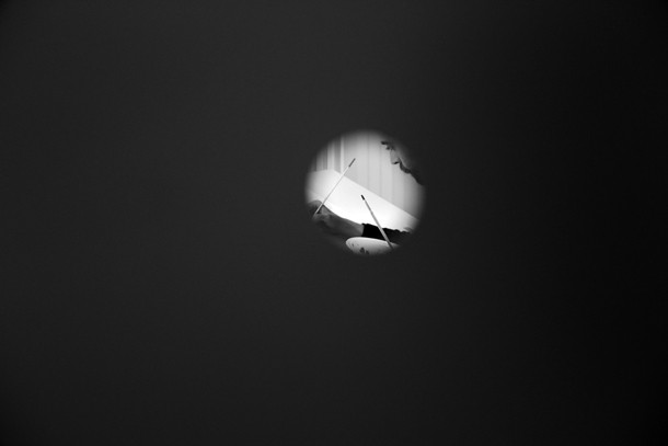 La gran caja blanca es una habitación cerrada pero iluminada. La luz regresa desde el mundo de la imaginación hasta el mundo real a través de los orificios perforados en sus paredes. Como le sucedía a Alicia en su viaje al País de las Maravillas, al aproximar el ojo a alguna de las mirillas que recorren las caras del cubo las distancias y el tiempo se difuminan. Las paredes parecen finas, pero al fijar la mirada a través de uno de sus orificios, las diminutas aperturas se transforman en potentes teleobjetivos, en caleidoscopios de sensaciones.