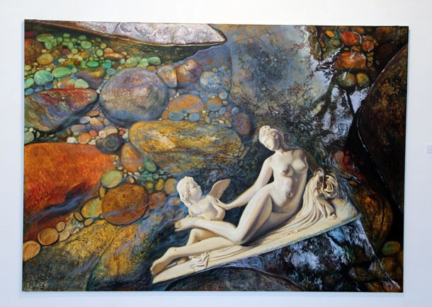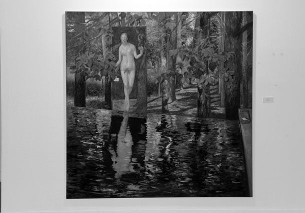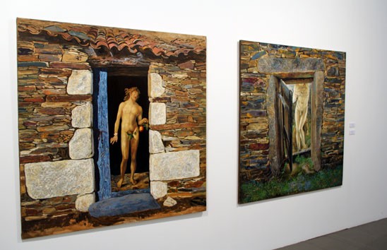 Dice Sánchez Adalid que “lo que sabe el hombre, lo sabe por el conocimiento adquirido por el paso del tiempo, por la experiencia”. Quizá se refiere a la adquirida en mil batallas por los caballeros medievales cargados con armaduras sobre sus corceles y siempre con el reloj en la muñeca. Es la serie ‘Paseos ecuestres’ que Badate conecta con Leonardo Da Vinci y Miguel Ángel Buonarroti. Ahí, la Mona Lisa observa desde el ventanuco de una casa de piedra la llegada de la primavera, mientras ‘El David’ muestra su Rolex; estaciones y segundos. Saltos temporales que parecen abarcar diferentes dimensiones al observar ‘Pecado Original’ y ‘Baño en la Alberca’, obras inspiradas en las pinturas de Adán y Eva de Durero. Eva parece llegar caminando desde un espacio situado en otro tiempo hasta el estanque en el que se ya se refleja. “La montaña, el agua, las cascadas, los riachuelos –apunta el artista-, los cambios de luz entre la noche y el día me fascinan”.