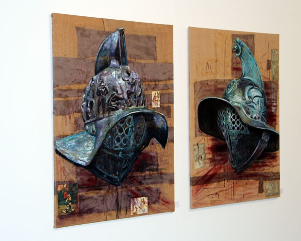 Así, la Venus de Milo surge misteriosa entre las ruinas de una cabaña sin cubierta y cuya sillería sitúa la escena en un paraje montañoso; Anfiario y Tideo –inspirados en el broce de los Guerreros de Riace- muestran en su muñeca derecha el Rolex mientras parecen dispuestos a la batalla; la recreación sobre el lienzo de un relieve de Afrodita añade una luminosa perla a la presencia del reloj, del mismo modo que asoman entre los paneles el rostro de Apolo o los cascos de los gladiadores.
