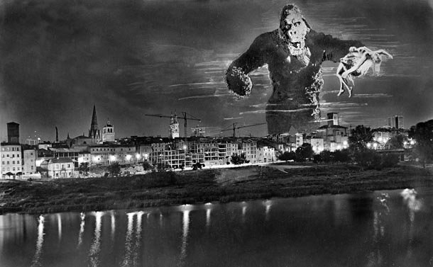 Entre las fluctuaciones de temperatura de las imágenes en el desierto o en el hielo, Jesús regresa en su revisión a su estudio y abre un capítulo especialmente divertido y creativo, “muy cercano –recuerda- a la artesanía”. Habla de la serie ‘Logroño imaginario’, de 1987. “En aquel entonces estábamos jugando con montajes fotográficos y me traje a Logroño a un montador fotográfico, América Sánchez, que tenía una fama tremenda. Coincidió que nos llamaron desde el Ayuntamiento para plantearnos la posibilidad de producir una exposición para las fiestas de San Bernabé y propusimos un Logroño Imaginario”. Es ahí donde surgen las imágenes de King Kong sobre el Casco Antiguo de la ciudad o Rita Hayworth en la escalinata del palacete del Gobierno regional.