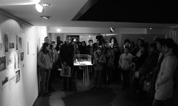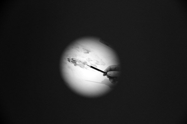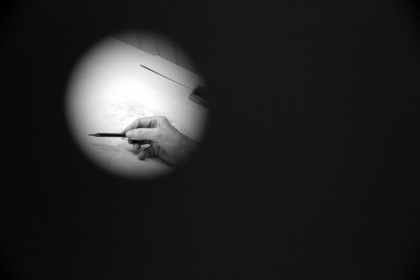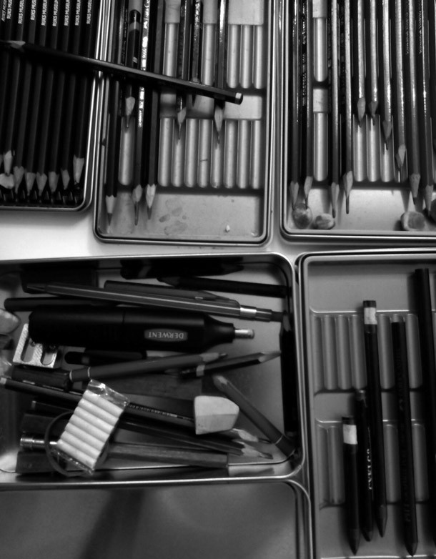 ‘Blanco sobre blanco’ es también el título de la obra que dibuja Rosa. “Se trata de un paisaje no muy abierto; un paisaje abstracto, con elementos cercanos y sin referencia del cielo”. Sobre la mesa, junto a la lámina en pleno desarrollo, puede observarse una fotografía y dos bocetos. “Siempre salgo a realizar las fotografías que empleo para mis dibujos –describe-, nunca utilizo imágenes hechas por otra persona. Necesito conocer el lugar, crear un relación con ese espacio, sentirlo, saber qué pasaba en ese momento, sí soplaba el viento o había un gran silencio”. Después, llega el momento de los bocetos. “Con los bosquejos en la mano –indica- comienzo a dibujar. Suelen ser obras de pequeño y mediano tamaño, aunque mi amigo José Carlos Balanza siempre insiste y me anima a realizar un dibujo de grandes dimensiones, pero…”.