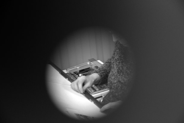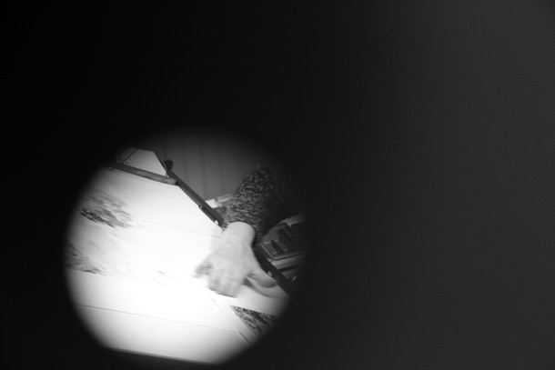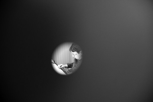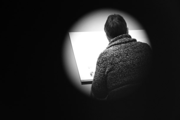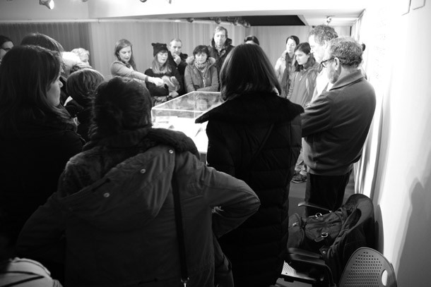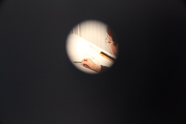 Son ya las doce del mediodía y mientras la artista dibuja en el interior de la habitación cerrada, una treintena de personas la observan curiosos a través de los diminutos ojos de buey que perforan sus paredes. Ese es el objetivo de ‘Curioseando Artistas’. Los visitantes se arremolinan alrededor de Marina Pascual, la promotora de la iniciativa. “Se trata precisamente de curiosear –les invita-, de acercarse al arte descubriendo el proceso creativo de los artistas, observándolos mientras desarrollan su creatividad”.