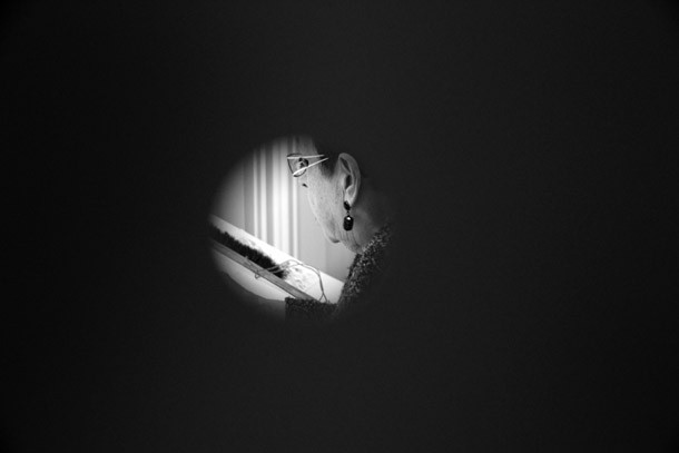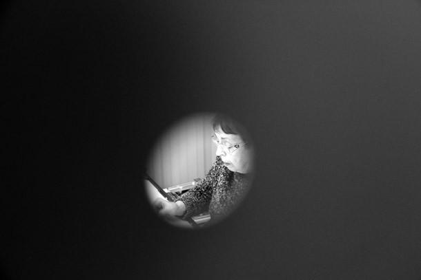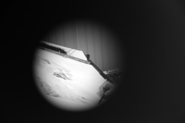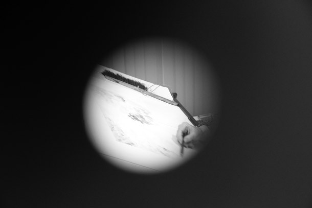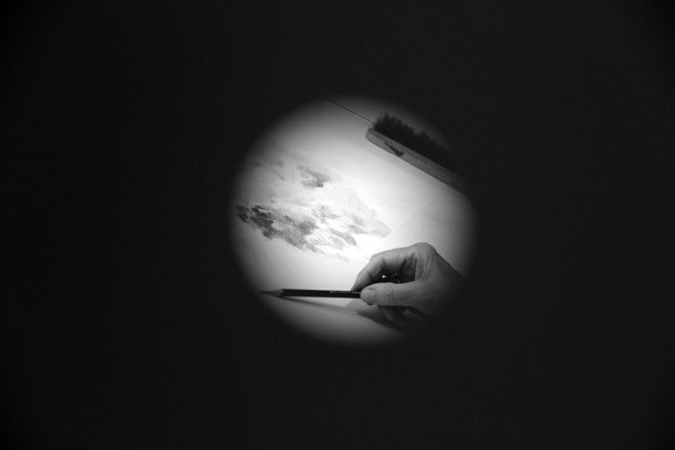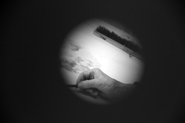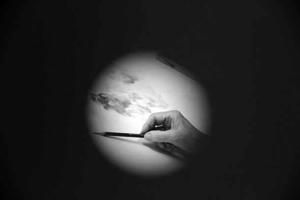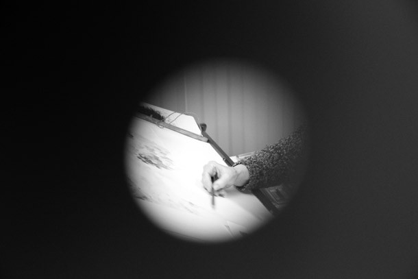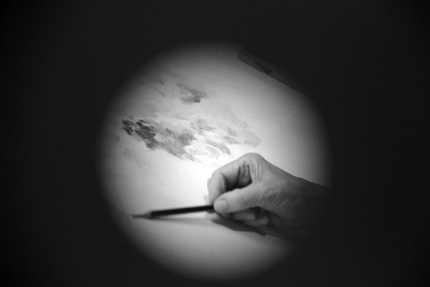 Hoy, Rosa no entiende un día sin sus lápices, pero al principio ¿por qué dibujar y no pintar? “Al principio fue una cuestión práctica, era lo que podía hacer en casa… luego, poco a poco, comprendí que era lo que realmente me gustaba”. Desde entonces, día a día, ha mantenido conversaciones con el paisaje… elevadas con los árboles y las montañas; llevaderas con las sendas y los caminos; abordando temas a ras de suelo con los arbustos y debatiendo con la rocas sobre si son un obstáculo o, realmente, sostienen las praderas y colinas… si le sumas el talento, no puedes extrañarte de que sea posible pintar la nieve sobre una lámina en blanco. Si acercas la mirada a los orificios que recorren la gran caja blanca en cuyo interior dibuja Rosa es posible que escuches la conversación./Javi Muro