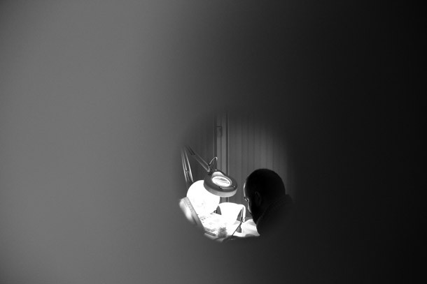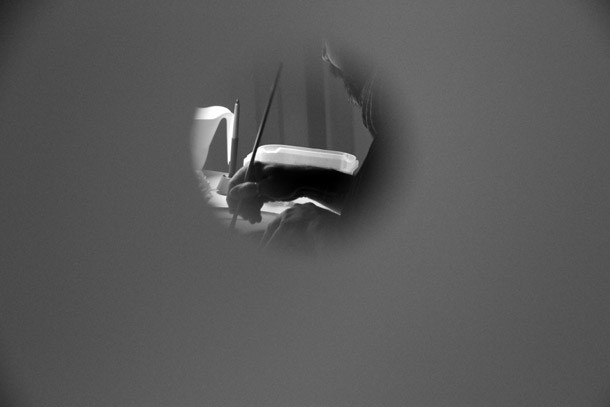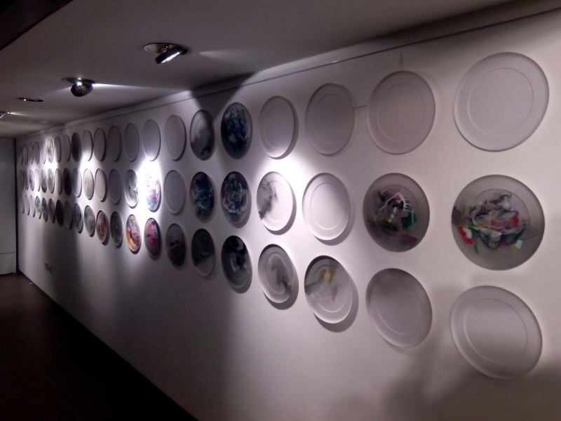 Situadas a diferentes alturas, las pequeñas mirillas permiten seguir la labor de Carlos Corres. Ha elegido unos platos de cartón gris como soporte de sus dibujos. Mientras realiza pruebas de color aclara que el proyecto nada tiene que ver con la gastronomía, “el soporte es tan sólo una excusa”. Apunta más bien a una reflexión sobre la vida o al hecho de haber alcanzado una edad en la que le apetecía recapacitar. “He llegado a un punto en mi vida –describe- en que necesitaba echar una mirada atrás y enseñar a la gente todo lo que he ido cultivando desde que era pequeño”. Recuerda que se carrera artística ha estado definida por la pintura. “Ahora –reitera- me ilusiona y me divierte generar en el espacio en blanco formas; hago lo mismo que un niño pero con el bagaje de la experiencia acumulada”.