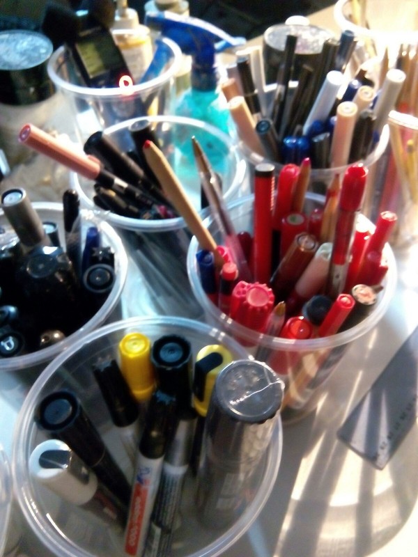 Habla Corres de sensación de libertad. “Todo lo que no he podido utilizar en la pintura lo puedo emplear ahora”. Y es que un vistazo al interior del estudio de ‘Curioseando Artistas’ parece constatar que Carlos ha recuperado el estuche del colegio. Pequeñas cajas de cartón acogen lapiceros de colores, rotuladores de diferentes tipos y grosor, ceras, bolígrafos y espráis. Con la mano firme traza sobre uno de los platos unas líneas que conectan con una espiral remarcada con antelación. Mientras, una pareja comparte y comenta a intervalos una de las mirillas y dos chicas jóvenes observan al artista desde la pared frontal de la caja. “Esa es la idea de ‘Curioseando Artistas’ –recuerda Marina Pascual, la directora de la actividad-, acercar el arte a las personas a través del conocimiento personal de los artistas y sus procesos creativos”.