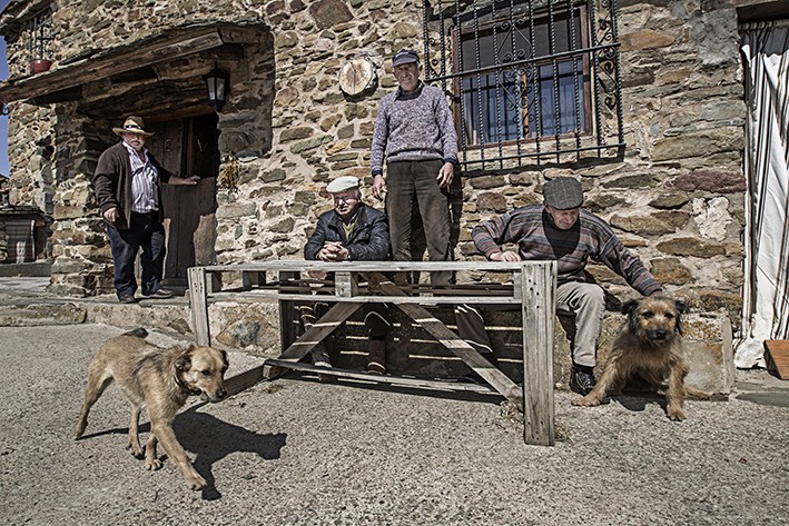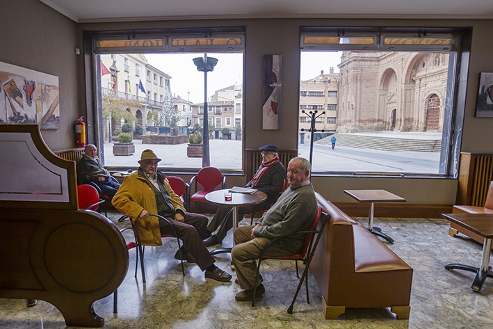 Justo recorre las imágenes expuestas en la Sala del Centro Caja Rioja-Gran Vía y evoca un trabajo “realizado con mucho cariño, muy amable, que necesitabas sentirlo, que podías realizarlo como mero espectador, que sin dejar de ser periodístico –porque se publicaba en un medio de comunicación- tenía algo de poético, de literario, hoy en el periodismo hay que contar algo más”. Pisaron los 174 pueblos que forman parte de La Rioja. Son muchas semanas en la carretera y el fotógrafo reconoce que a lo largo de tantos días influye las condiciones que te encuentras al llegar, climatológicas por ejemplo, y también el día que uno mismo tiene, pero tienes que mantener la mirada abierta a dejarse sorprender. “Recuerdo que el primer día, camino de Aguilar de Río Alhama, pensábamos que nos dirigíamos hacia Alaska. Al llegar nos refugiamos en el bar y allí estuvimos hablando con los vecinos. Comentando el frío que hacía, un hombre no contó que había tenido la opción de irse a vivir a Miami con su hijo, pero había preferido quedarse en Aguilar”.