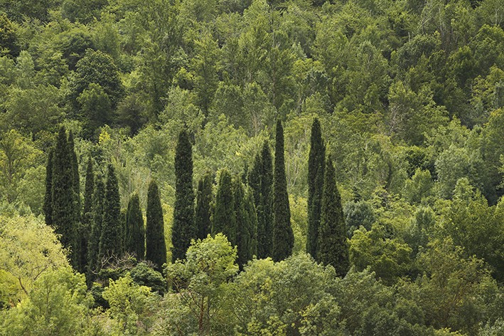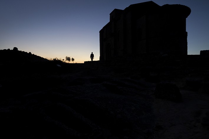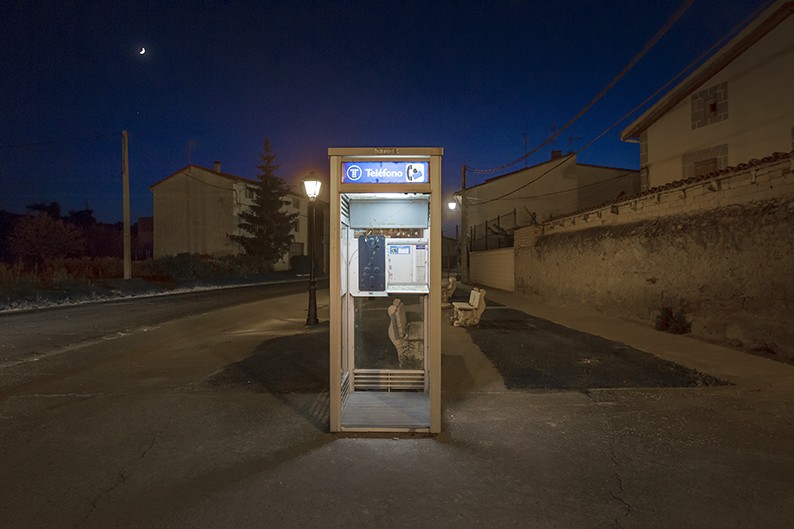 El fotógrafo se sitúa en el centro de la sala y gira sobre sí mismo dedicando un instante a cada una de las imágenes. “Tengo mis favoritas –destaca-, pero es una preferencia fotográfica, para evocar la historia que acompaña a cada una tengo que observarlas antes”. Justa señala hacia una imagen. Allí, la noche prácticamente ha caido sobre Peciña, el sol tan sólo resiste tras la colina y Santa María de la Piscina se ha transformado en una perfecta silueta entre sombras. Una figura humana sobrevive a la penumbra... ¿de dónde ha surgido?. Más allá, los cipreses se alzan entre el bosque diverso de Anguiano. Allí está el camposanto... entre verde esperanza. En Tormantos también es de noche y la única luz en la calle procede de una cabina de teléfono. Parece desubicada, parece esencial. En Santa Marina, sus vecinos hablan y reivindican, con normalidad a la puerta de la casa de uno de los vecinos, aprovechando el sol y la presencia de los forasteros. Quel no es Detroit, pero desde lo alto y en la noche la iluminación de sus calles y del polígono industrial la confunden con esas grandes metrópolis en las que las luces crear recorridos infinitos y laberínticos. “¿Por qué estas y no otras? Siempre busco que las fotografías tengan una composición muy equilibrada”./Javi Muro (visita galería)