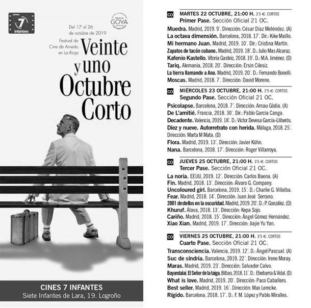 La cita comienza el martes, día 22 de octubre a partir de las 21 horas en ambos lugares, Teatro Cervantes de Arnedo y Cines 7 infantes de Logroño y se prolonga hasta el próximo viernes, 25 de octubre, con el fin de dar a conocer la totalidad de los contenidos. Aquí os dejamos el calendario de dichas proyecciones y os animamos a que no dejéis pasar la oportunidad de conocer las sorpresas que nos deparará la edición VEINTE Y UNO. ¡Larga vida a Octubre Corto!/Isabel Ribote