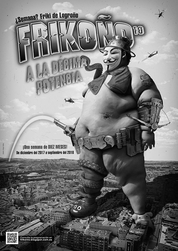 Y llegamos a 2018, diez añazos después. Y lo celebramos con una edición que dura diez meses. Calculo que ha habido unos ciento cincuenta eventos frikis en todo este tiempo. El lema de la primera Semana fue Todo cabe en el FRIKOÑO; ha habido charlas, debates, presentaciones de libros, concursos de todo tipo, fiestas, proyecciones, teatro, conciertos, gamberradas, exposiciones, desfiles... He disfrutado de momentos de auténtica magia. Un amigo me habla de una novela de ciencia ficción (Carbono alterado) en la que aparece la realidad aumentada (fue la primera vez que escuché hablar de ello), y me dice que meta algo así en el festival (¿pero cómo voy a desarrollar yo eso?); meses después me llama un tío majísimo y me dice que su empresa informática quiere llenar el cielo de Logroño con naves de Star Wars mediante realidad aumentada (y así fue en 2010 y 2011). Un evento de baile en la sala Biribay en el que la catarsis se apodera de los participantes terminando todos por el suelo haciendo la lombriz. Tensa entrevista radiofónica del facha Luis Herrero. Especial musical Diez años de FRIKOÑO en Fallo de sistema de Radio 3. Insultos a George Lucas el día de su cumpleaños Cinco ediciones del magnífico GROTESQUE!... ¡FRIKOÑO prevalecerá!/Tarilonte