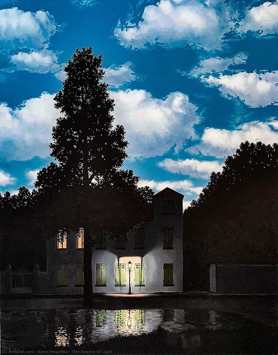 En ‘El imperio de las luces’, Magritte genera una iluminación contradictoria. Un claro oscuro en los límites de la realidad. Un cielo azul surcado por nubes de algodón, reina sobre una casa en penumbra en la que sus inquilinos han encendido la luz en algunos de sus estancias. La línea superior de los árboles y el edificio conecta ambas realidades.
