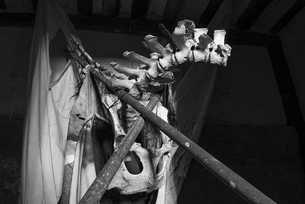 'Fragmentos Rituales' comenzó a gestarse el pasado verano y lo hizo con tres líneas de acción: economía de recursos, sostenibilidad y respeto al lugar. En las piezas que Zorromono presenta en EspacioArteVaca el artista utiliza materiales creativos que incorporan la idea de transformación orgánica y "una reflexión sobre el aprovechamiento de los recursos en el mundo rural, bien por necesidad o bien por ingenio". En esta propuesta, en Viniegra ha trabajado con materiales que han experimentado un proceso de cambio físico como el jabón, que él mismo elabora con las instrucciones de su abuela, el carbón, los huesos de animales o los componentes de la Cooperativa agrícola de su pueblo. En su proceso creativo, en el que ha llegado a utilizar 50 litros de aceite usado, el artista observó "cómo el jabón semifresco envolvía el hueso dotándole de una nueva piel, cómo interactuaban ambos materiales entre lo limpio y lo sucio, la vida y la muerte a un paso. Como un elemento más, ha introducido en esta ocasión, el sonido; planteado a través de la interacción de piezas con el agua o el entrechocar libre de metales".