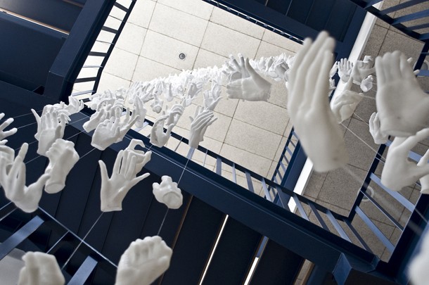 ‘Habitar el vacío’ es una instalación colectiva realizada con motivo del décimo aniversario de La Gota de Leche. Consta de 300 piezas de cera y resina creadas a partir de diez reproducciones de las manos de los artistas, hilo de nailon y topes de aluminio. 'Habital el vacío' quedará instalada de forma permanente en La Gota de Leche./J.M.
