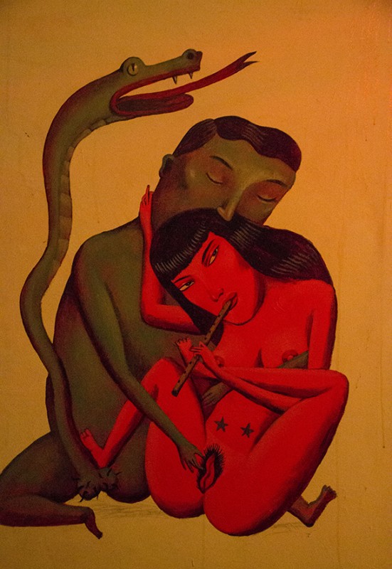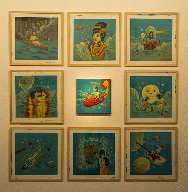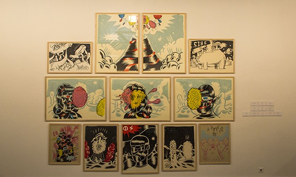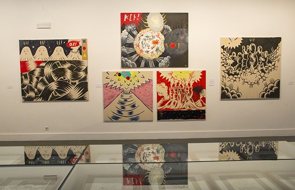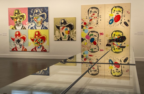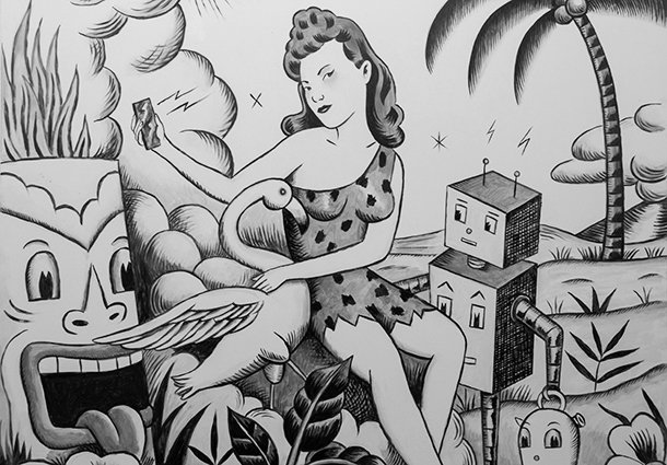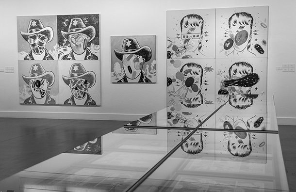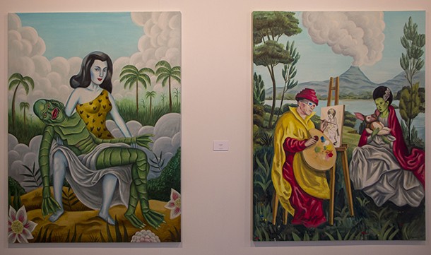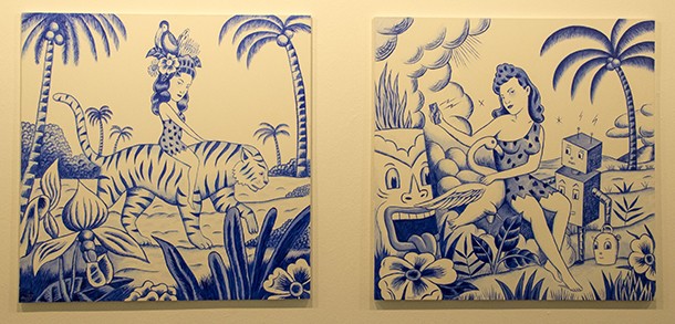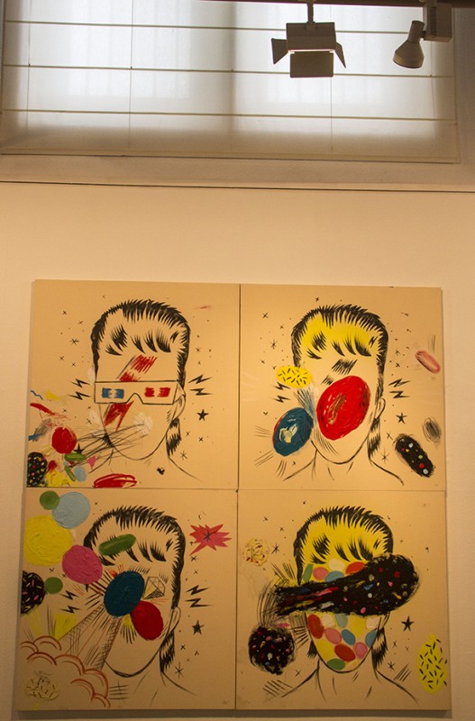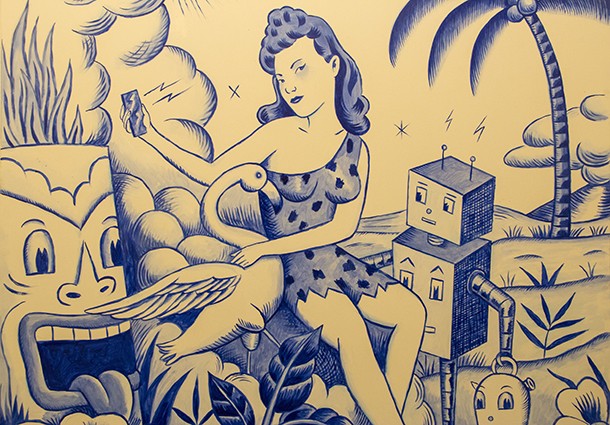 marillos, rosas, azules celestes, potentes verdes y rojos intensos, la paleta de color del arte pop domina el ala norte de la Sala Amós Salvador. Allí destacan Bowie y las tres dimensiones, la serie warholiana del sheriff cuatricolor, los volcanes que extraen la vida desde el centro de la tierra -Julio Verne y el relato de aventuras como referencia-, las colinas que tienen ojos, la muerte de Mickey Mouse, la mujer y el hombre lagarto llegado desde las profundidades marinas y el guiño al cine clásico de ciencia ficción en ‘El monstruo de la Laguna Negra’ -previa a ‘La forma del Agua’-; o las ilustraciones del ‘El mundo perdido’, de Arthur Conan Doyle. La ciencia ficción como eje narrativo y filosófico. Incluso una mujer de piel verde -puro lagarto- mece a Gizmo, el gremlin bueno. Enfrente -y de más reciente factura- destacan los azulejos ilustrados que decoran el restaurante’Bazaar Mar’, del cocinero español José Andrés en Miami; o el ‘Cleo Restaurant’, del Mondrian Hotel situado en Park Avenue de Nueva York. También, resaltan en la muestra proyectos como ‘Tipical Spanglish’, ‘Tropical Window’, o la serie dedicado el sexo mitológico -de una mitología de seres de propia creación- ubicada en un céntrico reservado. Cierra la exposición el proyecto de diseño gráfico que acompañó al disco ‘El Poeta Halleey’, de Love of Lesbian. Una propuesta que fue premiada con el Grammy Latino al mejor diseño 2016.