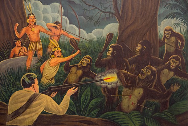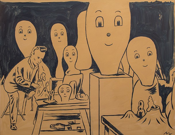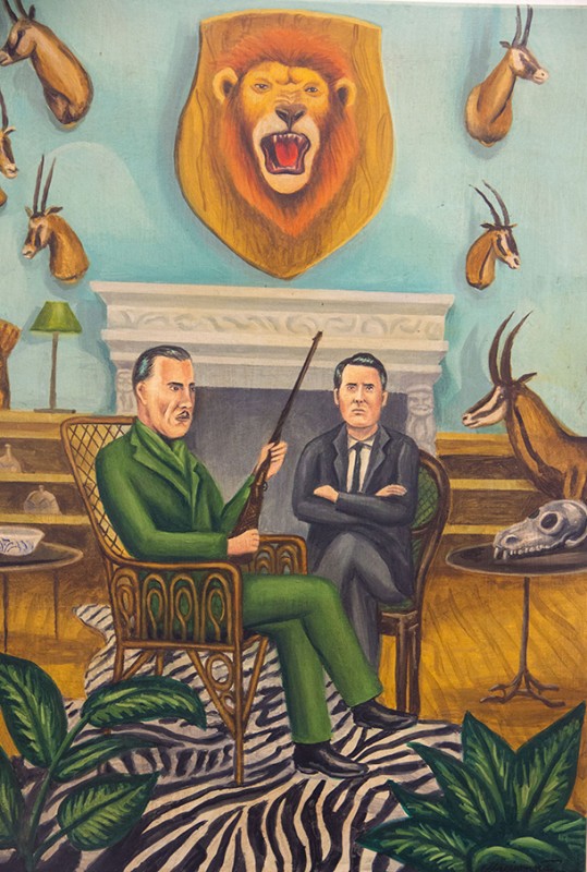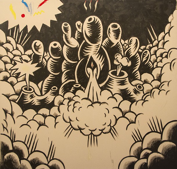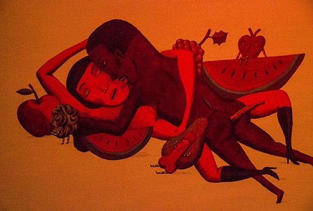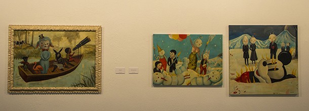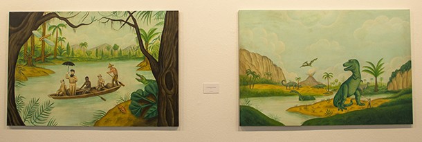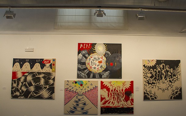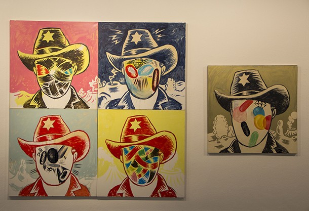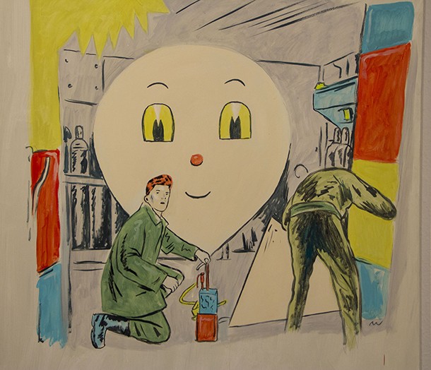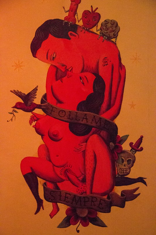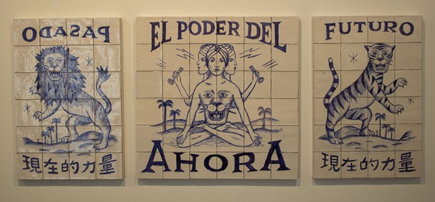 marillos, rosas, azules celestes, potentes verdes y rojos intensos, la paleta de color del arte pop domina el ala norte de la Sala Amós Salvador. Allí destacan Bowie y las tres dimensiones, la serie warholiana del sheriff cuatricolor, los volcanes que extraen la vida desde el centro de la tierra -Julio Verne y el relato de aventuras como referencia-, las colinas que tienen ojos, la muerte de Mickey Mouse, la mujer y el hombre lagarto llegado desde las profundidades marinas y el guiño al cine clásico de ciencia ficción en ‘El monstruo de la Laguna Negra’ -previa a ‘La forma del Agua’-; o las ilustraciones del ‘El mundo perdido’, de Arthur Conan Doyle. La ciencia ficción como eje narrativo y filosófico. Incluso una mujer de piel verde -puro lagarto- mece a Gizmo, el gremlin bueno. Enfrente -y de más reciente factura- destacan los azulejos ilustrados que decoran el restaurante’Bazaar Mar’, del cocinero español José Andrés en Miami; o el ‘Cleo Restaurant’, del Mondrian Hotel situado en Park Avenue de Nueva York. También, resaltan en la muestra proyectos como ‘Tipical Spanglish’, ‘Tropical Window’, o la serie dedicado el sexo mitológico -de una mitología de seres de propia creación- ubicada en un céntrico reservado. Cierra la exposición el proyecto de diseño gráfico que acompañó al disco ‘El Poeta Halleey’, de Love of Lesbian. Una propuesta que fue premiada con el Grammy Latino al mejor diseño 2016.