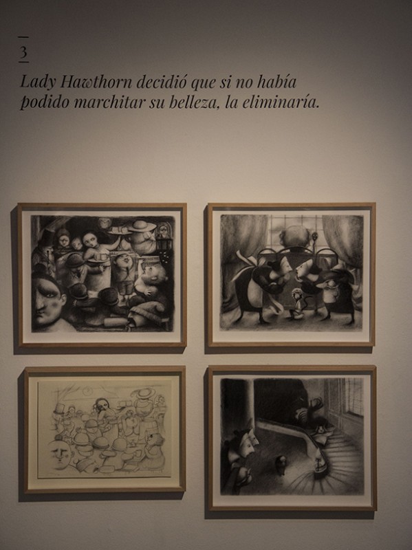 Al otro lado está la imaginación, la fantasía, los acontecimientos extraordinarios. Al otro lado, de tiempo en tiempo, cruzan personas con talentos portentosos que a su regreso cuentan historias fabulosas de forma sorprendente. Hay quien al puente entre una y otra dimensión narrativa lo denominó madriguera y creo un país de las maravillas. Hay quién para contar, ya sea con palabras o lapiceros y pinceles, tan sólo atraviesa el umbral de una puerta. Una puerta que no se abre a cualquiera. Es preciso contar con una sensibilidad especial para relatar, para ilusionar a través de la propia imaginación y despertar la del otro; para al enlazar las palabras, trazar dibujos, crear ilustraciones, dar color o difuminar carboncillos surja la magia de las buenas historias. Al adentrarse en la Sala de Exposiciones de la Escuela de Diseño de La Rioja (ESDIR) la magia se siente al instante. Las ilustraciones de Ana Juan llaman al visitante desde todos y cada unos de los rincones, dirías que están en conexión unas con otras con independencia de que pertenezcan a relatos diferentes. Los personajes de ‘Otra vuelta de tuerca’ -la novela de Henry James- y los de Snow White -Blancanieves- conviven en complicidad, parecen decirse unos a otros: “¡Ei! Un nuevo visitante. ¡Qué sienta la magia!