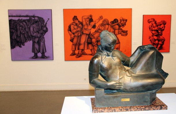 El catálogo te ofrece pistas para no perderte y las sigues te dejas llevar por los relatos que cuentan las pinturas y esculturas de Dalmati y Narvaiza llegarás a la expresividad de las manos de sus protagonistas. Manos que hablan, como las que contaba Rubio Dalmati que observaba cuando era un niño y contemplaba, desde abajo, desde su aún pequeña estatura, las conversaciones de los mayores, pláticas de dedos, puños y palmas; sobre todo de palmas abiertas porque la obra de Dalmati y Narvaiza habla de de eso, de unión, de los horrores de la guerra, de concordia y pacifismo./Javi Muro