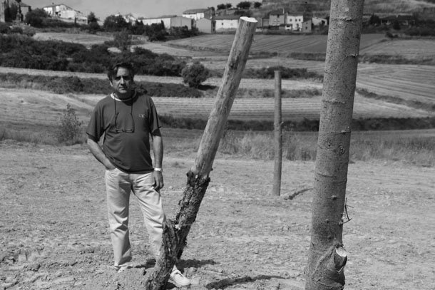En la carretera, a tan sólo unos metros, Carlos Rosales camina hacia una finca que parece recién arada. Alrededor, los terrenos aún mantienen una tupida manta de espigas de trigo. Este año el cereal ha llegado tardío y no ha dado tiempo de segar. “Para mí –explica- era importante volver al mismo sitio diez años después y poder reflexionar sobre qué ha pasado conmigo y con el lugar”. En aquel 2003, en su proceso de búsqueda creativa, Carlos Rosales constató como el sol entraba al fondo y se reflejaba en una pequeña colina situada enfrente. Ese juego de luz y esa línea imaginaria creada fueron moldeando aquella colina hasta identificarla con un altar y dando cuerpo a la que sería su obra en aquel primer ‘Arte en la tierra’, ‘ARA’. “Me ayudó mucho –explica- una frase que dice algo así como ‘esta colina era su altar y el mundo su templo’”.Ahora, en 2013, diez años después ha buscado, “de una forma un tanto inconsciente", la misma línea imaginaria. En ese trazado ha situado una árbol seco que pinta de oro. “Se trata de un doble juego –indica- por una lado está la idea de aquellos pintores que salían del estudio para capturar la luz natural y, por otro, el concepto del árbol caído que se transforma a través de la pintura, pintándolo no sobre lienzo, sino sobre la propia naturaleza. Hoy en día, si algo se puede considerar sagrado es la naturaleza”.
