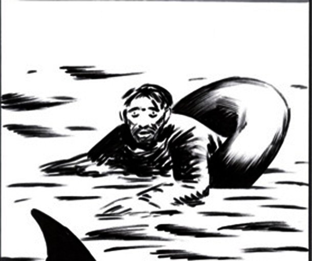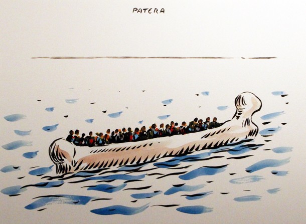“Según las leyes del mercado, si el náufrago tiene más hambre que el tiburón, se comerá al tiburón…”. El texto acompaña una ilustración en la que un hombre agarrado a un flotador y a la deriva en medio del mar observa a un escualo dar una y otra vuelta alrededor suyo. Suele decir Andrés Rábago, El Roto, que él tan sólo es un observador, pero todos sabemos a ciencia cierta que desde hace tiempo forma parte de nuestra conciencia. Muchas veces, al descubrir su viñeta diaria en El País –diario que publica sus dibujos desde principio de la década de los 90- comprobamos que una vez más dice en voz alta lo que nosotros pensamos pero muchas veces callamos. En ‘De lado a lado/Del lado alado’ –la exposición que acoge la Sala Amós Salvador de Logroño hasta el 12 de noviembre- pueden contemplarse los dibujos originales con los que El Roto, en entonces aún OPS, comenzó a caminar por la senda del humorismo gráfico, pero también su otra faceta, la de pintor, la que firma Rábago, más personal, menos urgente y vertiginosa.