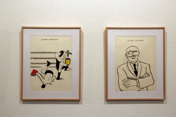 La muestra confronta los dos géneros que Andrés Rábago ha cultivado en su carrera, el humorismo gráfico y la pintura. Los dibujos que presenta la exposición promovida por Cultual Rioja –Ayuntamiento de Logroño y Gobierno regional- se retrotraen en el tiempo, a una época en la que era más difícil ser crítico. Al recorrer el espacio dedicado al dibujo en ‘De lado a lado/Del lado alado’ no deja de llamar la atención lo actuales que resultan viñetas esbozadas cuarenta años atrás. El propio autor no se cansa de repetir que los errores se vuelven a repetir; añadiendo el agravante de la incorporación de mayores y mejores medios tecnológicos. Ni en la exposición ni en su espacio en la prensa diaria hay que tratar de encontrar una viñeta que haga referencia a lo inmediato, a lo que acaba de ocurrir. La espuma no le interesa, dice. El humorismo gráfico de El Roto se sustenta en la reflexión prolongada en el tiempo aderezada con grandes dosis de ironía y punzadas satíricas. El Roto es satírico.