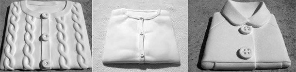 Sol Martinez trabaja con cerámica blanca realizando esculturas sin esmaltar, buscando las formas simples y austeras de elementos cotidianos como la vestimenta.