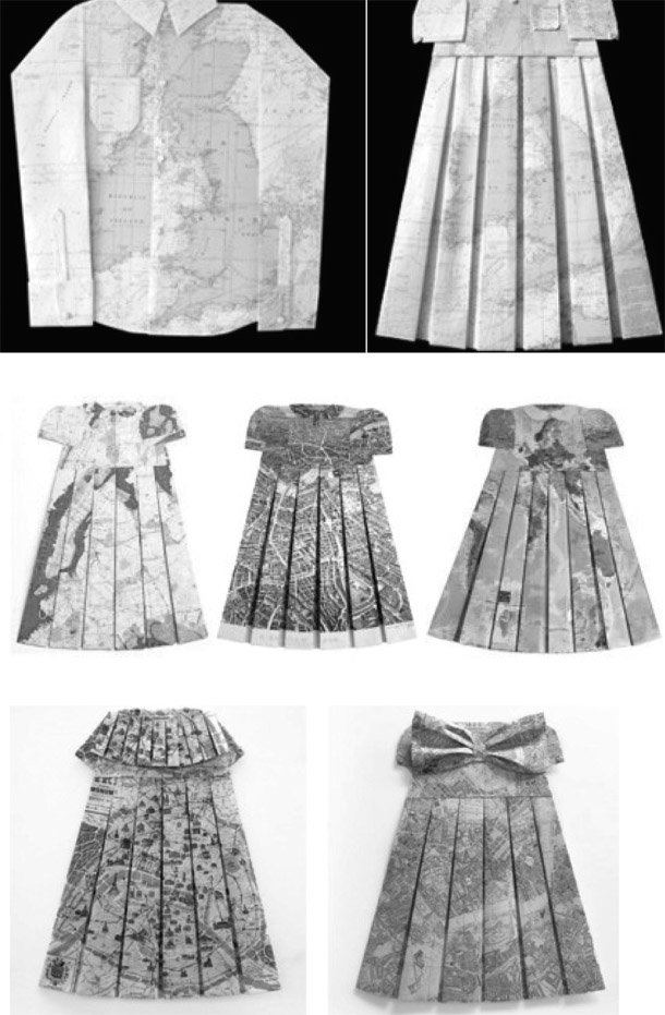 Elisabeth Lecourt, por su parte, utiliza también las formas puras y los materiales delicados en su serie 'Les robes géographiqes' (2011-2012), donde recrea de una forma graciosa e infantil vestidos y camisas con papel, con técnicas de origami. El material que utiliza son antiguos y coloristas mapas de papel, viejas cartografías que nos conducen a la idea de que la ropa que llevamos es también un mapa de identidad.