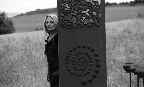 En el punto más alto de Santa Lucía el asfalto de las calles cede ante el camino de tierra que desciende hasta los campos de cultivo. Abajo, en la parcela contigua a la cruceta de señales que apuntan al molino o a la ermita, trabaja la escultora Julia Rubio. “Me motivaba el proyecto Arte en la Tierra –sentencia-, me idéntico con la idea que propone porque yo trabajo la tierra, a través de la cerámica, de pintarla, la utilizo es un elemento que utilizo en todos mis obras”. El atractivo de Arte en la Tierra para Julia no concluía ahí. “Además, está el componente comunitario, de comunicación con las gentes del pueblo, la idea de compartir, de colaborar. Ha sido increíble la gente que se ha implicado, la cantidad de amigos que han formado las cuadrillas para ayudarme”.