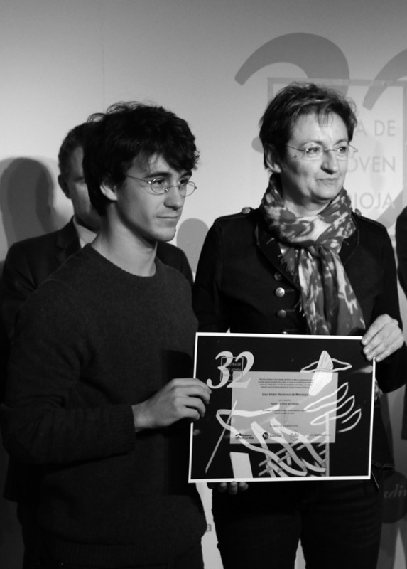 El presidente del Gobierno de La Rioja, José Ignacio Ceniceros, utiliza su teléfono móvil para hacerse una foto junto al artista y la obra ganadora. Tan sólo unos minutos antes, Ceniceros le ha entregado a Ignacio Beltrán el galardón. En su intervención, el presidente del Ejecutivo regional ha felicitado a los jóvenes premiados y ha expresado su deseo de que estos galardones sirvan de "estímulo para impulsar" sus vocaciones artísticas y favorecer su futuro. Ceniceros ha animado a los jóvenes a "mirar lejos" porque la Muestra puede ser "un resorte para desarrollar al máximo su talento y conocimiento” y ha expresado el "apoyo y aliento del Gobierno de La Rioja a la profesionalización de los jóvenes artistas. Nos hemos propuesto apoyar la emancipación de nuestros jóvenes, potenciar su papel como creadores y promover su profesionalización en el arte y el diseño".