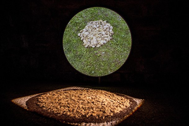 Lucía Loren (olfato) ha creado la obra ‘Petricor’, palabra griega que remite a la piedra y a la esencia que corre por las venas de los dioses en lugar de la sangre, y que hace referencia al olor que desprende la tierra mojada. Loren se ha inspirado en la sensibilidad humana y, como reseña Balanza, “en la inteligencia y en la conciencia desarrolladas por la naturaleza mediante la compleja relación que mantiene todo lo que compone la materia”. Relaciones de colaboración y simbiosis, apunta el comisario de la muestra.