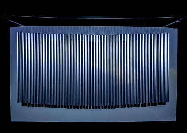 El oído es ha sido el sentido de referencia para Carlos Rosales que ha creado ‘Eco’, una representación de la naturaleza formada por una imagen de nubes, hierba y helechos, agitados por el viento que, a su vez, choca contra una cortina de tubos de aluminio, convirtiéndose en sonido. “Es la realidad representada -indica Rosales-, es la realidad, la del momento, y es la realidad de la interacción de las realidades anteriores”. La obra de Carlos Rosales concede verosimilitud a lo oído y visto mediante la ilusión. Así lo entiende el comisario de la exposición, “y lo hace mediante la representación: la metáfora, lo que distingue a la materia de la materia, aquello que se es capaz de poner en relación para poder entender. Viento filmado que mueve el escenario donde se proyecta para que escuchemos por medio de la acción del pensamiento”. ‘Eco’ es, lo dice el propio autor, “la realidad estremecida por la representación”.