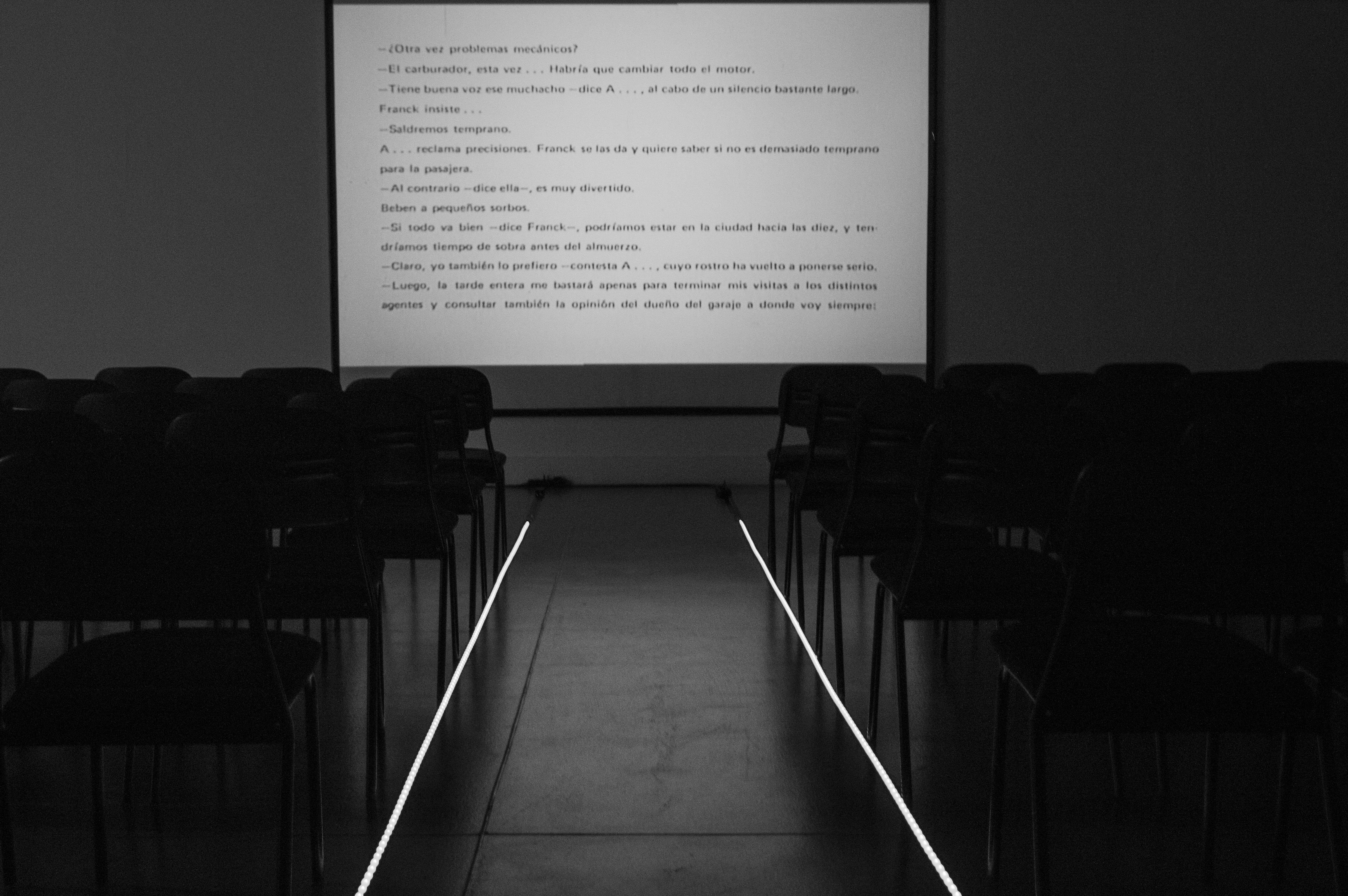 El proceso podrá contemplarse en vivo el sábado 8 de septiembre, cuando Isidoro Valcárcel pronunciará la conferencia ‘Otra historia del cine’. Lo hará desde una cabina, al mismo tiempo que superpone en el proyector dibujos e ilustraciones sobre la película, creando una nueva narración. Al día siguiente, domingo 9, impartirá la conferencia ‘9 secuencias sobre la pantalla’. Ambas intervenciones, a priori efímeras, quedarán registradas y desde ese momento formarán parte de la exposición. Se sumarán así a las obras -proyecciones ya instaladas como ‘La celosía’ (1972. Una proyección audiovisual de 115 minutos de duración. Se trata de la filmación literal, página a página, del relato literario de Alain Robbe-Grillet. “Este trabajo -cuenta Castro- quedó en el baúl de los recuerdos hasta ahora, la filmación cuenta con el acompañamiento de las voces en la locución, tanto en el original en francés como en la traducción, del propio Valcácer Medina y Esther Ferrer”.